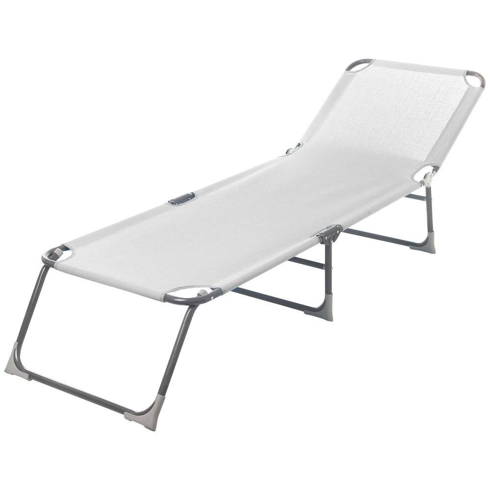 Klappbare Strandliege mit witterungsbeständigem Syntex Bezug und robusten Metallgelenken.