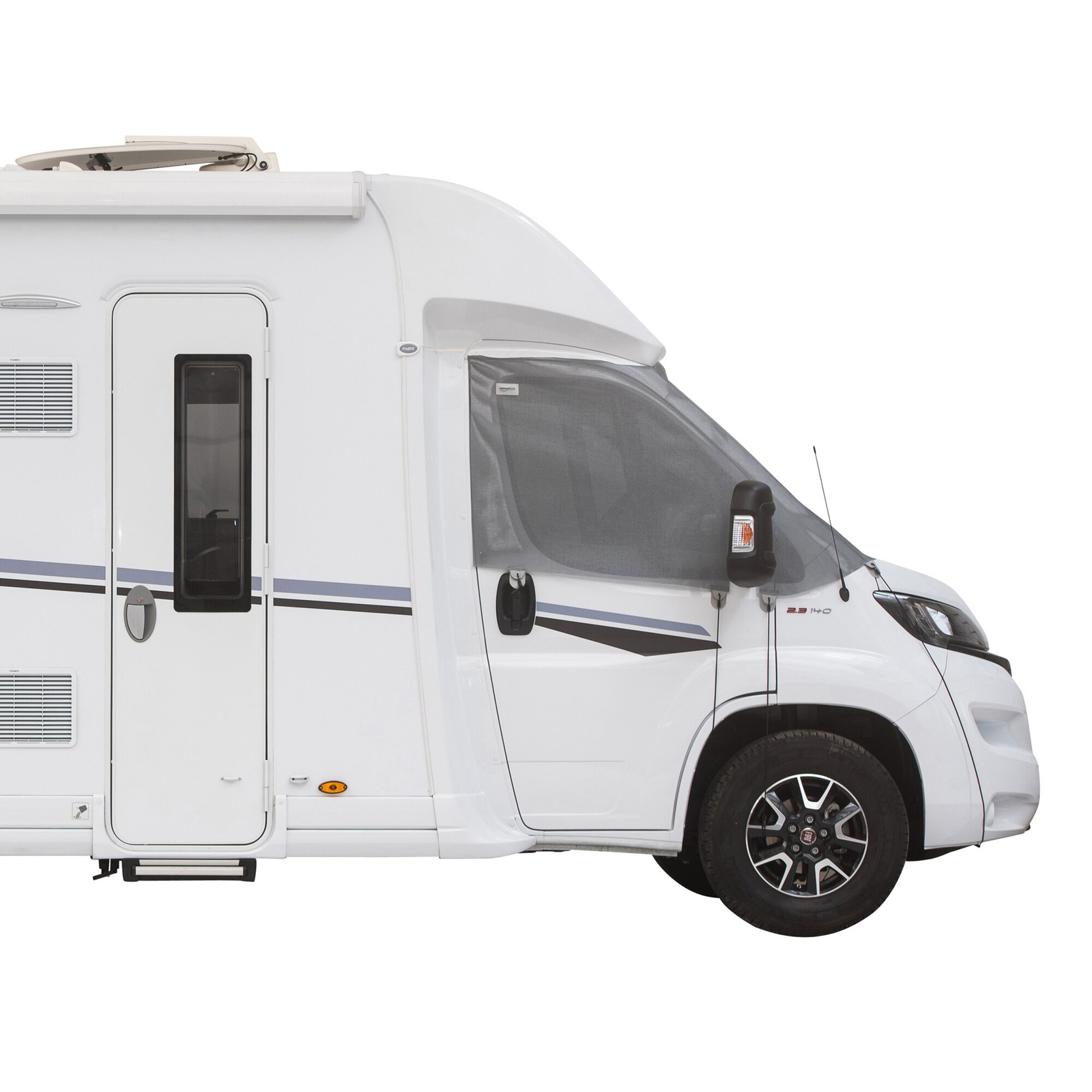 Innovative Außenmatte, die durch ihre graue Außenseite optimalen Schutz vor Sonneneinstrahlung und unerwünschten Einblicken bietet und von innen ungehinderten Ausblick gewährleistet. Sie wird mittels Türtaschen an beiden Fahrzeugtüren eingehängt und zu den Außenspiegeln bzw. Radkästen abgespannt. Im Lieferumfang sind Gummispanner enthalten.