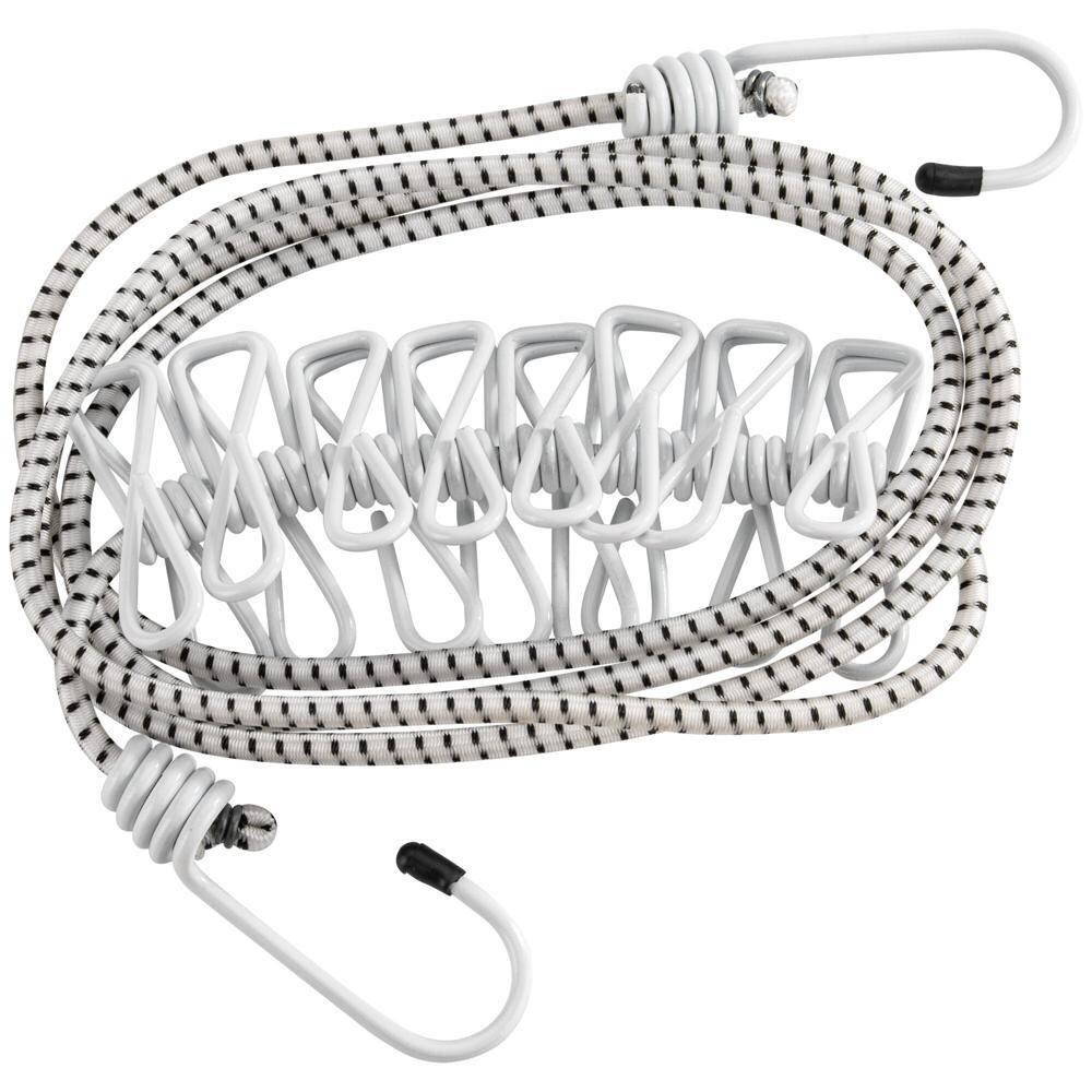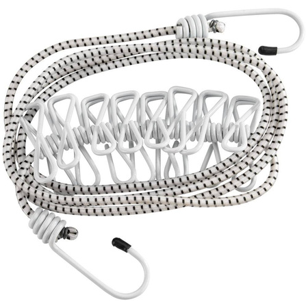 Expanderleine zum praktischen Aufhängen von Wäsche. Leinen mit 8 Klammern, 2 Einhängehaken und 115 – 180 cm Länge.