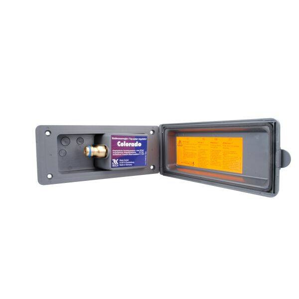 Der Stadtwasserregler Colorado ist ein Außenwasseranschluss zur direkten Versorgung Ihres Wassersystems im Fahrzeug. Tanks oder Kanister werden somit umgangen. Der integrierte Regler mit Rückschlagventil ist für einen Eingangsdruck bis 12 bar geeignet und reduziert diesen auf einen Ausgangsdruck von 0,7 bar. Der Schließdruck beträgt 1,1 bar. Der Stadtwasserregler Colorado sitzt in einem Gehäuse aus eingefärbtem, UV-beständigem ABS (Acrylnitril-Butadien-Styrol) Kunststoff, welches bei Nichtgebrauch durch einen Deckel mit Schnappung aus gleichem Material verschlossen wird. Der Schlauchanschluss auf der Eingangsseite erfolgt mittels handelsüblicher Schlauchkupplung. Das gefällige und neutrale Design fügt sich harmonisch in die Linie Ihres Fahrzeuges ein. Die Innenmaße der Durchreiche sind 90 x 110 mm. Ausgangsdruck 0,7 bar, Schließdruck 1,1 bar, in rechteckigem Gehäuse mit Deckel.