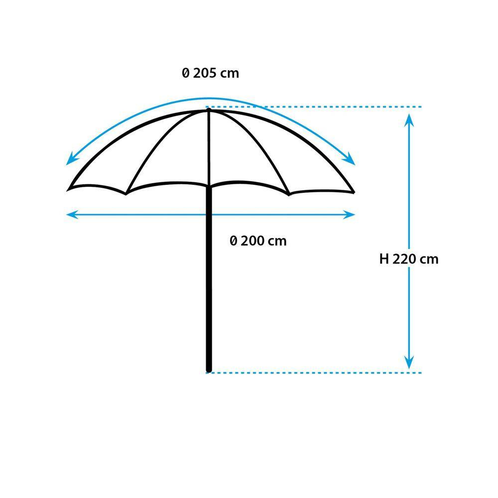 Sonnenschirm für den Strand mit 6 stabilen Speichen. Stiel ø 3,2 cm aus pulverlackiertem Stahl mit Alu-Knicker und großer, integrierter Eindrehschraube für sandige Böden. Sehr windstabil dank zentralem Entlüftungsbalg. Attraktives Design. Mit Tragetasche.