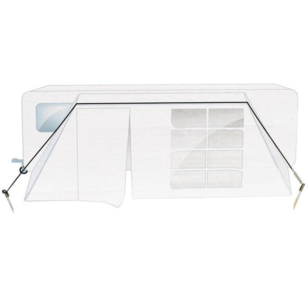 Universal-Sturm-Abspannband für Vorzelte und Markisen. Bestehend aus 2 Gurten mit 11,5 m und 1,5 m Länge, 1 starken Spiralfeder und 2 extrastabilen Heringen.