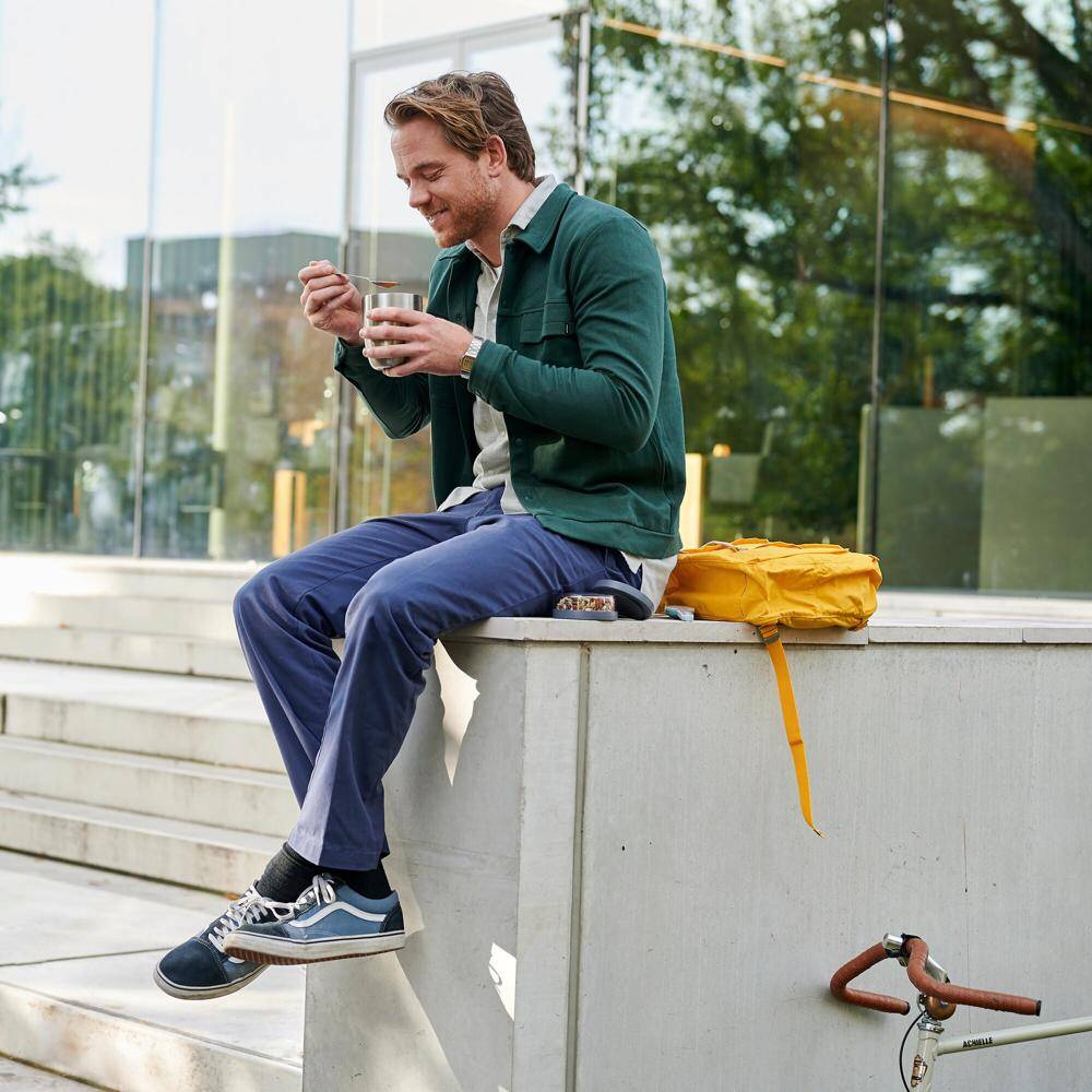Der vakuumisolierte Becher hält 6 – 8 Stunden warm und 12 Stunden kalt.