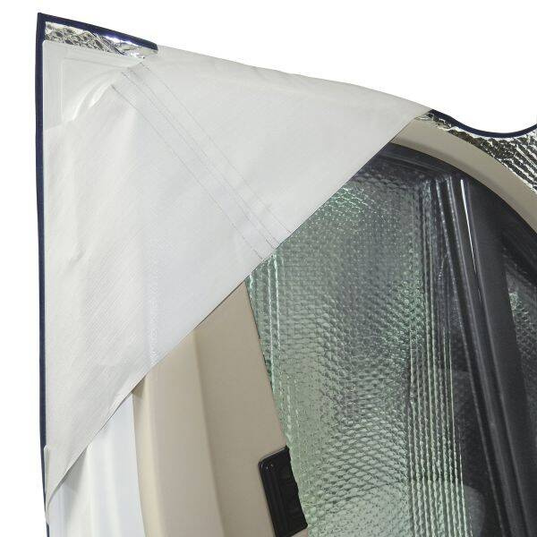 Passgenau gefertigte, zweiteilige Außenisoliermatte, die die Wärme im Innenraum hält und so die ideale Wärmedämmung für den Winterurlaub darstellt und hilft, Heizkosten zu sparen. Sie setzt sich aus jeweils einem separat erhältlichen Ober- und Unterteil zusammen. Das Oberteil isoliert den Bereich der Front- und Seitenscheiben, das Unterteil deckt den nicht isolierten Motorraum, die Radhäuser und den Fußraum ab, wodurch eine großflächige Außenisolierung für das komplette Fahrerhaus entsteht und den Wohnkomfort im Winterurlaub deutlich erhöht. Die eingearbeitete Windblende schützt vor Zugluft unterhalb des Fahrerhauses. Die Außenflächen der leichtgewichtigen, ca. 20 mm starken Isolierung (Unterteil ca. 10 mm) bestehen aus wetterfestem und kräftigem PE-Gewebe, die Innenisolierung aus Polyester speichert keine Feuchtigkeit.