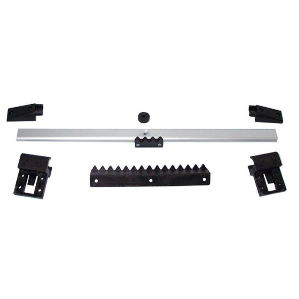 Horizontal ist die Schiene blockiert. Durch Anheben der Tischplatte ist diese in beide Richtungen verschiebbar. Inkl. Endstücke, Raster, untere Schiene und Plattenträger.