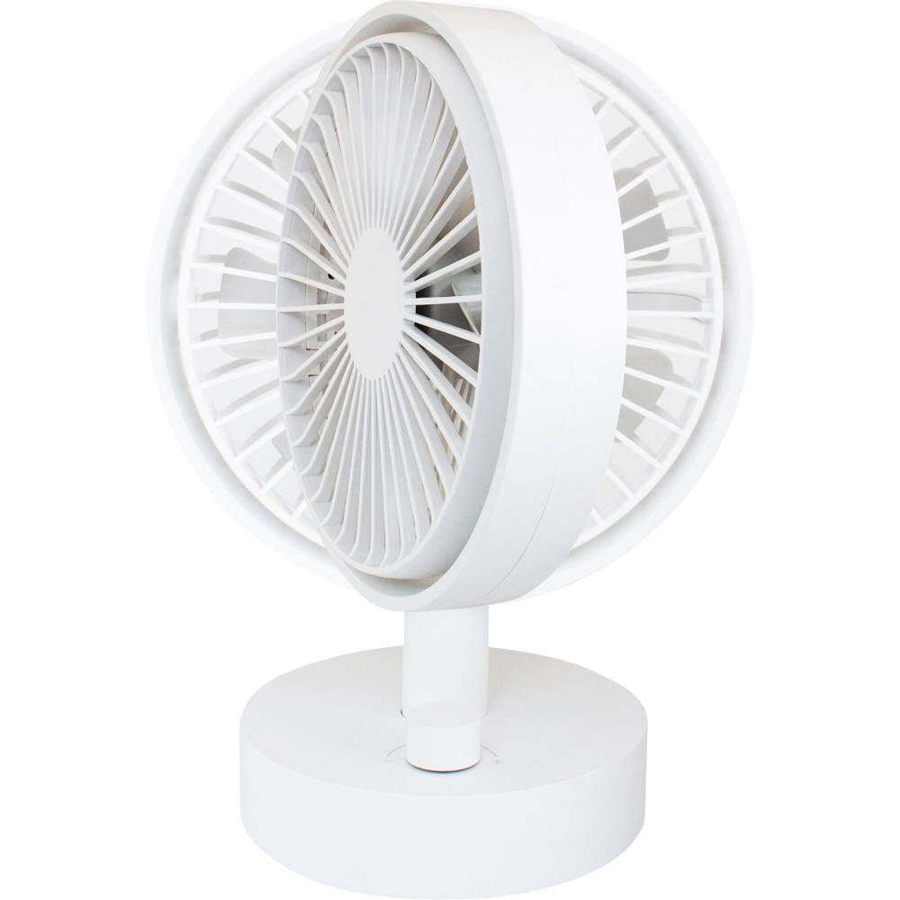 Der Ventilator kann um 70° nach oben und unten eingestellt werden. Stufenlos einstellbare Lüftergeschwindigkeit durch Drehen des Knopfes. Die Oszillationsfunktion kann ein- und ausgeschaltet werden. Die eingebaute wiederaufladbare 4000-mAh-Polymerbatterie bietet dem Lüfter max. 9 Stunden Arbeitszeit (abhängig von der Geschwindigkeit). Maße Ventilator ohne Fuß ø 14,5 cm, Maße gesamt B 16,9 x H 23,6 x T 12 cm, Gewicht 406 g.