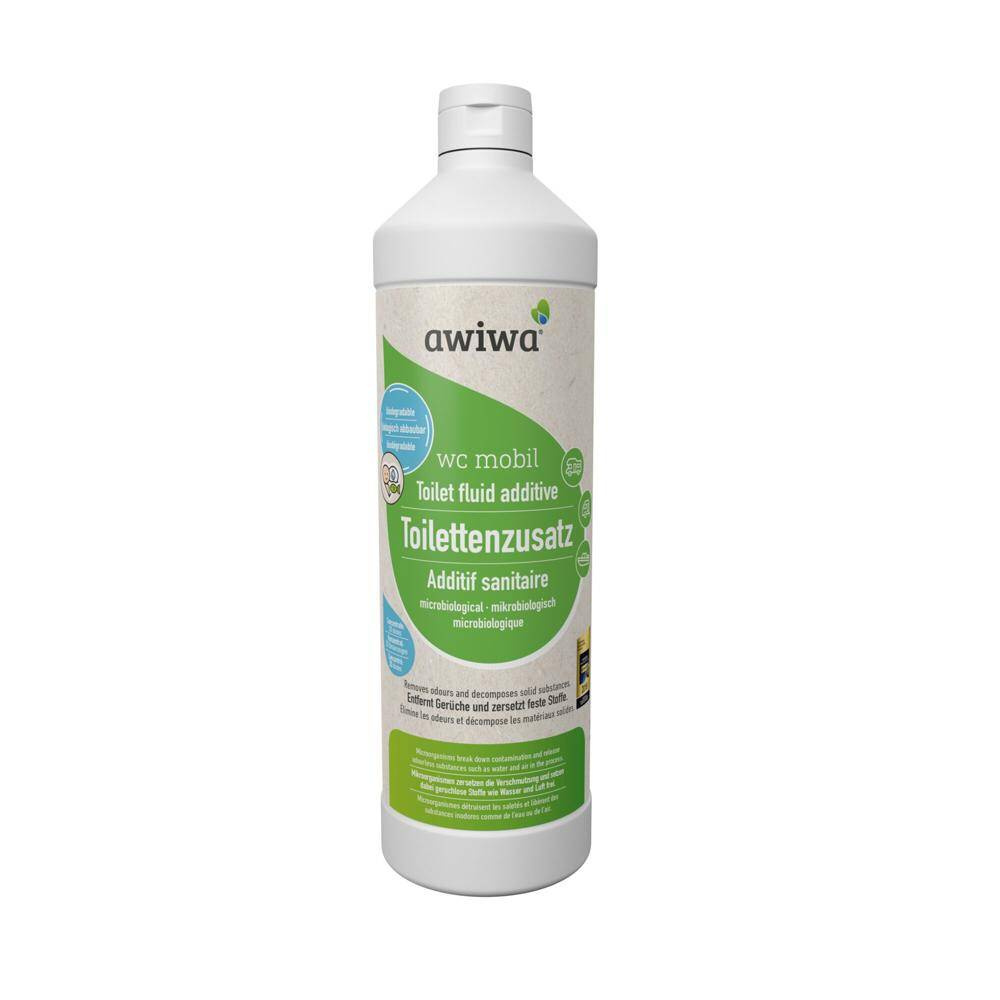 Der mikrobiologische Toilettenzusatz awiwa wc mobil verkleinert mit seiner hochwirksamen Formel aus Enzymen und natürlichen Mikroorganismen Fäkalien und Hygienepapiere und sorgt somit für eine spritzfreie Entleerung des Fäkalientanks: keine Klümpchen, kein Verstopfen und kein Geruch. Unangenehme Gerüche werden beseitigt und nicht überdeckt. Hygienisch sauber und chemiefrei für eine umweltbewusste Entsorgung. Der Tankinhalt kann in der Toilette entsorgt werden. Geeignet für jede mobile Toilette im Wohnmobil, Wohnwagen oder Boot. Sehr ergiebig: 1 Liter reicht für 20 Anwendungen.