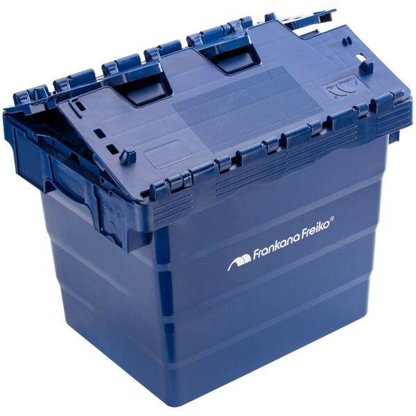 Stapelbare Kunststoffbox mit zweiteiligem Klappdeckel für einfaches Be- und Entladen. Vollständig geschlossene Seitenwände und Boden. Stabil und bequem stapelbar mit geschlossenem Deckel. Platzsparende Lagerung durch leicht konischen Körper. Offene Kisten können einfach ineinandergeschachtelt werden.