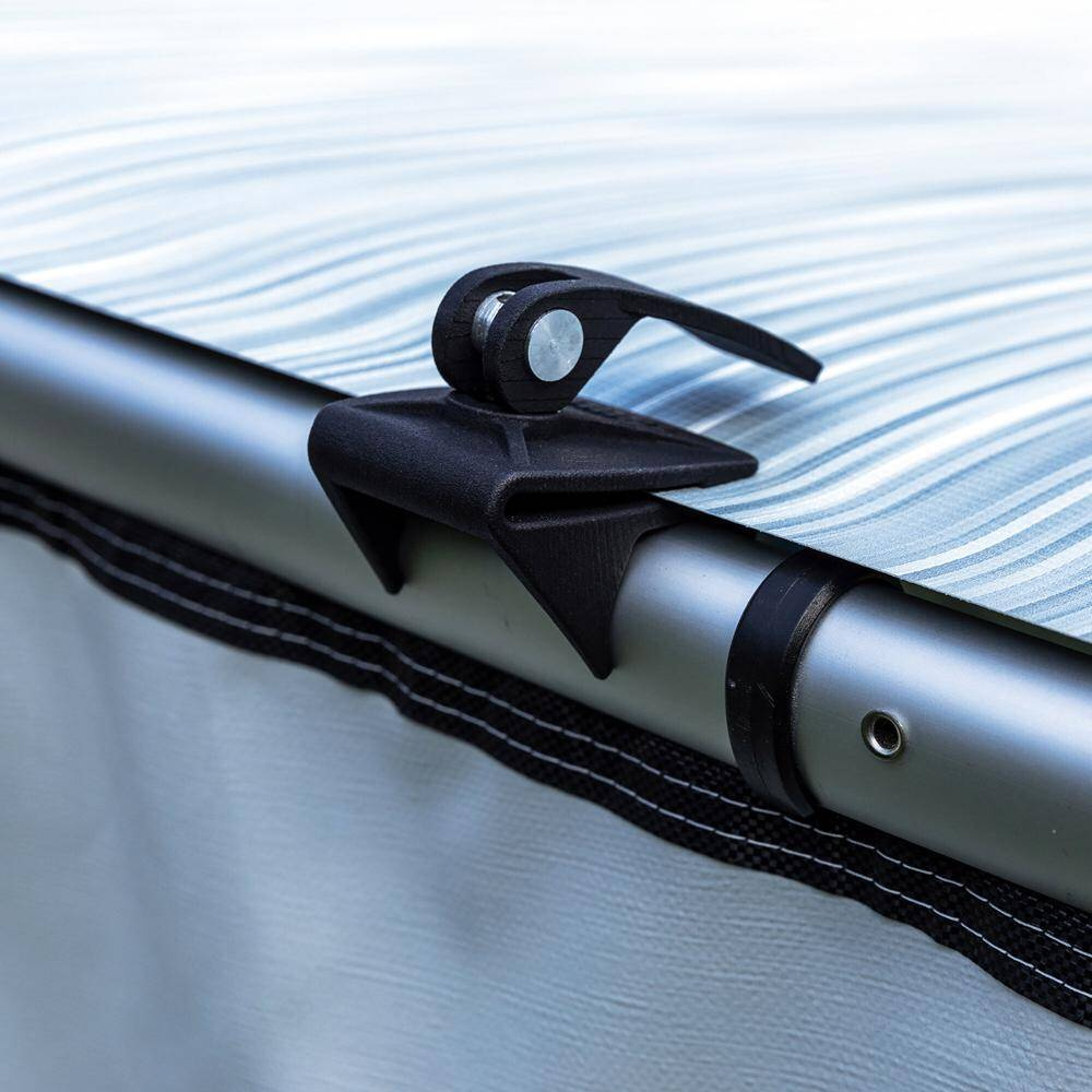 Diese Klemmen sorgen für eine sicherere Befestigung des Markisentuchs an der Markisen- oder der Blocker-Spannstange, um das unangenehme Geräusch eines durch Wind flatternden Markisentuchs zu vermeiden. Die Klemmen passen universell auf alle Thule Spannstangen aus Aluminium, einfach einrasten lassen, das Tuch dazwischen legen und mit dem Griff festziehen. Inhalt 2 Stück.