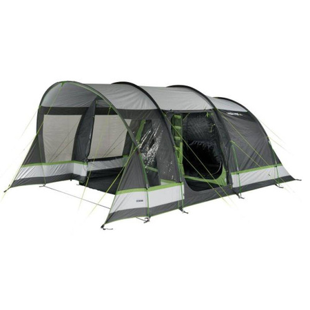 Familien-Tunnelzelt mit eingenähtem Boden hält Feuchtigkeit, Schmutz und Krabbeltiere aus dem Zelt. Das große Vordach mit Klarsichtfolien-Fenster spendet Schatten und schützt vor Wind und Wetter. Die Verandafront lässt sich je nach Wetterlage komplett öffnen und den Wohnbereich vergrößern. Der Wohnraum in 2 m Stehhöhe bietet Platz für die Camping Ausrüstung. Der wettergeschützte Eingang hat ein großes Moskito-Fenster, was variabel von innen zu bedienen ist und wird als Dauerventilation eingesetzt. Der Seiteneingang mit Moskitotür belüftet zusätzlich den Wohnbereich. 2 Klarsichtfolienfenster bringen Licht in den Wohnraum, Gardinen schützen vor neugierigen Blicken. Die Bodenwanne an der Front kann mittels Reißverschluss heruntergeklappt werden und verhindert Stolperfallen. Das Dach hat eine Aluminium-Beschichtung und ist Hitze reflektierend. Die High Peak 3- Stufen “Dual Flow“ Ventilation“ im Schlafbereich passt sich jeder Wettersituation optimal an.