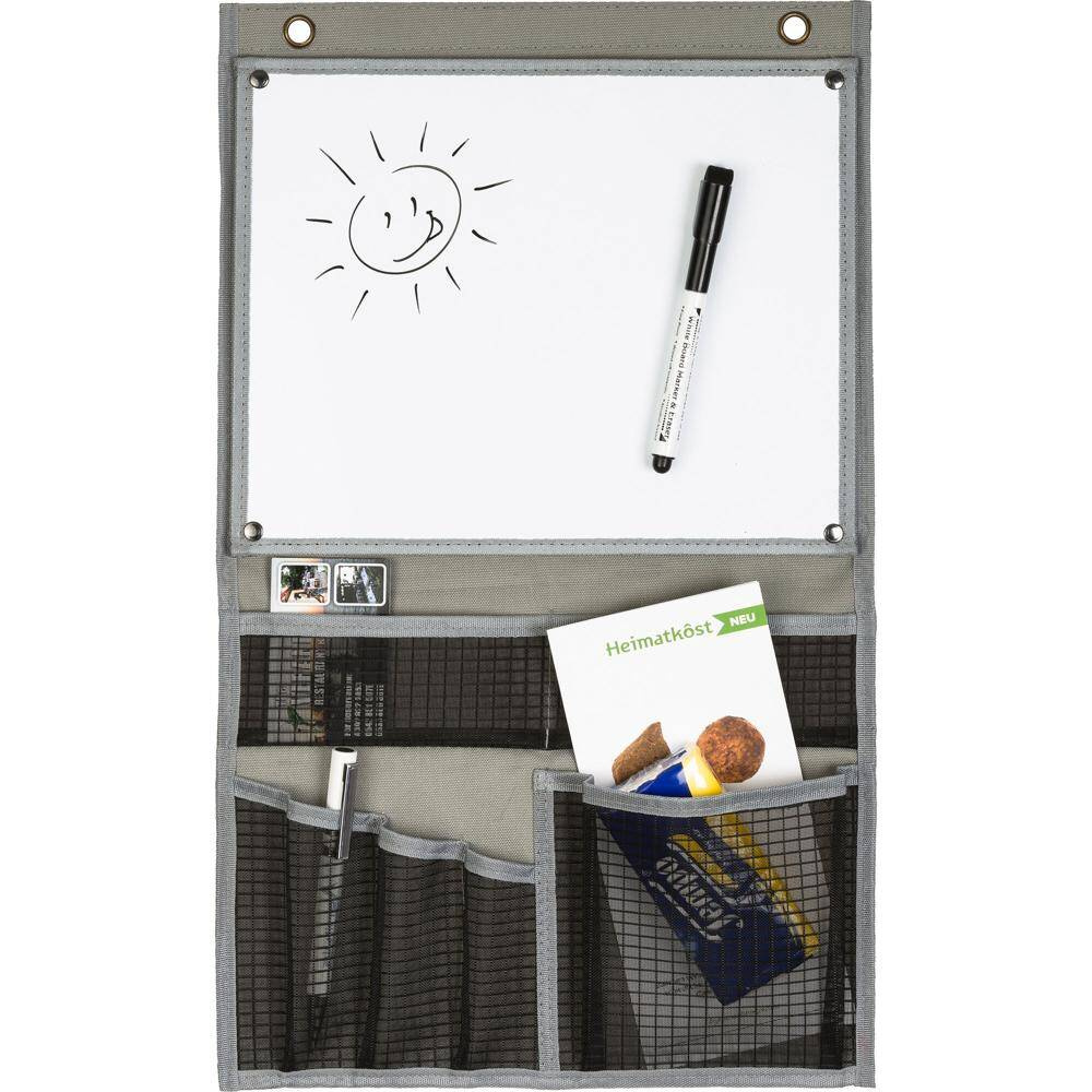 Flache Utensilientaschen, die der Planung und Organisation dienen. Die schmale Ausführung nimmt – wie eine Pin- oder Magnetwand – Dokumente aus Papier o. Ä. auf. Die große Variante besteht im oberen Bereich aus einem beschrift- und abwischbaren Memoboard. Ein schwarzer Marker ist im Lieferumfang enthalten. Im unteren Bereich sind beide mit Netztaschen ausgestattet.