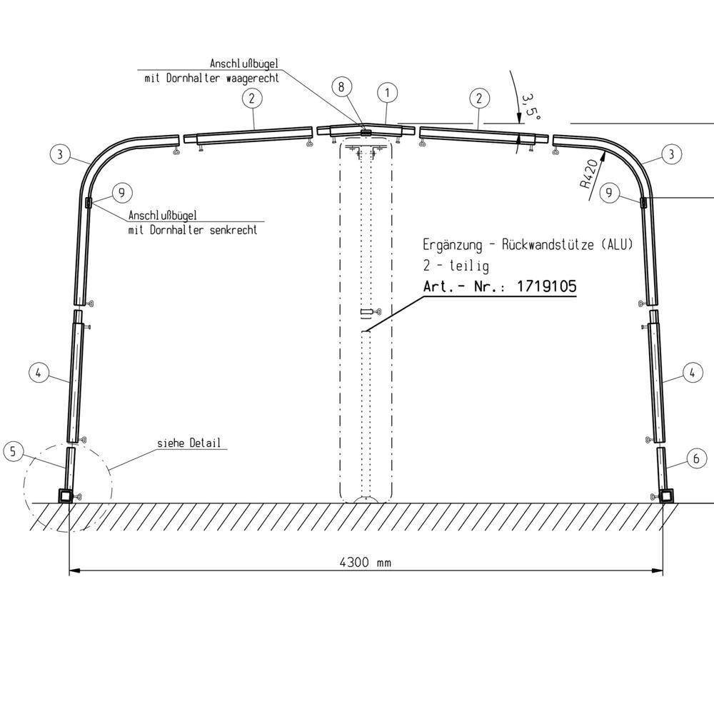 Für die Präsentation von Reisemobil- und Wohnwagen-Vorzelten in einer Ausstellung.Mit diesem senkrecht stehenden Rückwandrahmen können Vorzelte einzeln in einer Breite bis 4,30 m und einer Höhe von 2,6 m oder gegeneinander zwei Zelte eingezogen werden. Es besteht die Möglichkeit durch optionale Zwischenstücke die Zeltbreite/Umlauflänge zu erweitern.Material: Alu-Profile für den Einzug des Vorzeltkeders, beidseitig mit Radien.