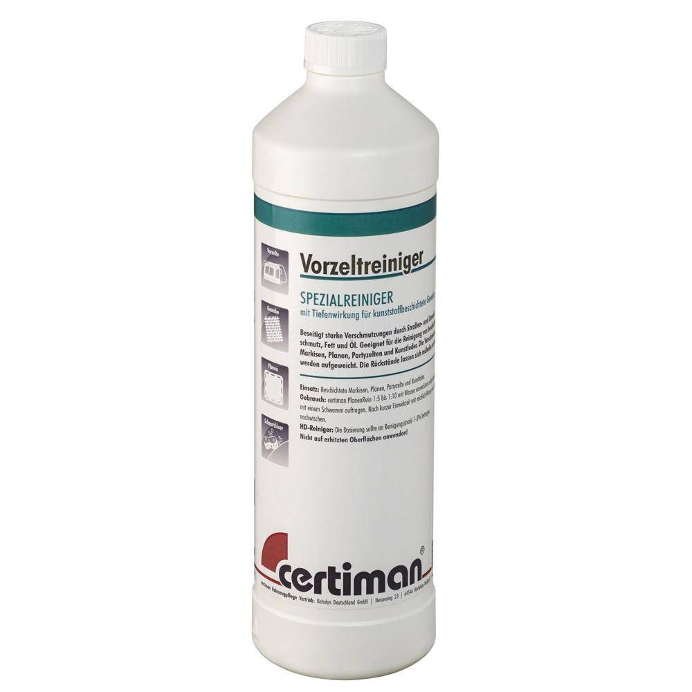Für eine gründliche Reinigung von beschichteten Markisen, Planen, Partyzelten und Kunstleder sorgt der Vorzeltreiniger. Es beseitigt starke Verschmutzungen durch Straßen- und Umweltschmutz, Fett und Öl. Certiman Vorzeltreiniger 1:5 bis 1:10 mit Wasser verdünnen, aufsprühen bzw. mit einem Schwamm auftragen und nach kurzer Einwirkzeit mit reichlich Wasser und Schwamm nachwischen.