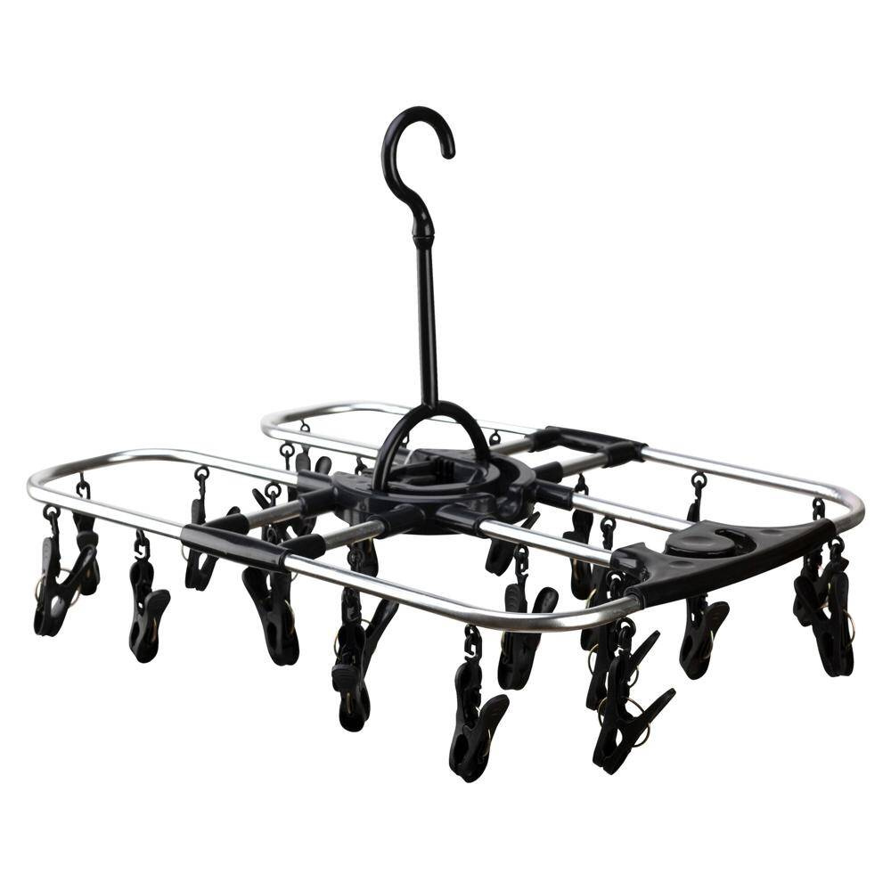 Passend für alle Rohre mit einem Durchmesser von 32 – 50 mm dank variabler Klemmvorrichtung und integriertem, stabilem Aufhänger. Mit 24 Wäscheklammern. Material: Alu-Rahmen mit Kunststoffelement.